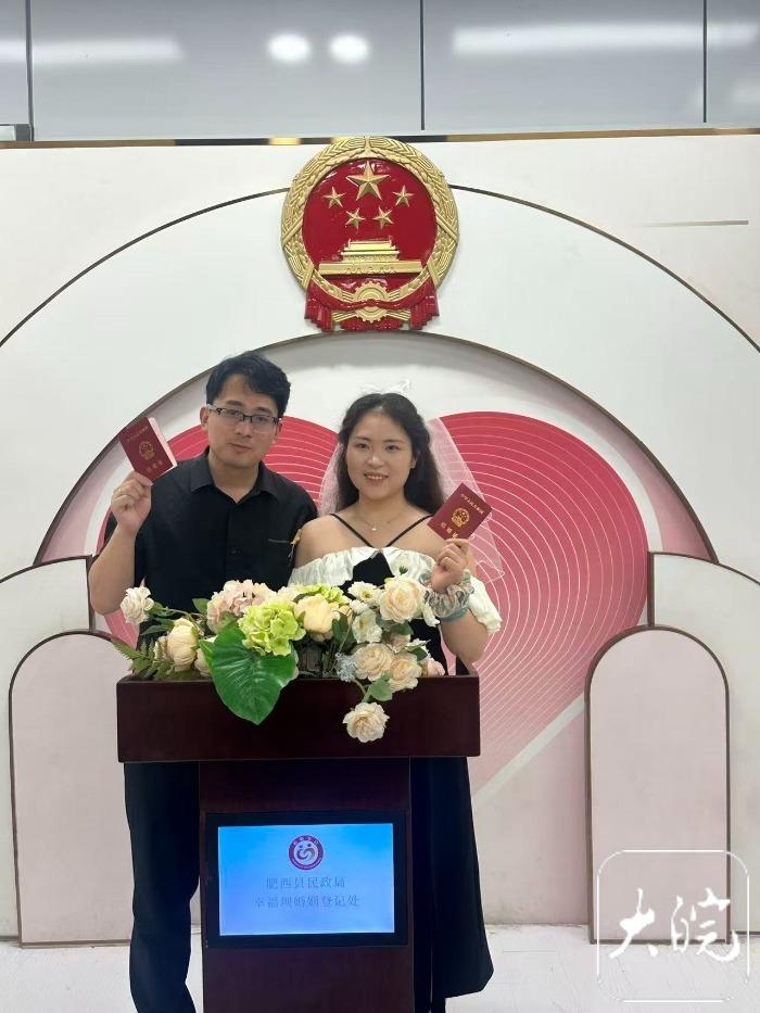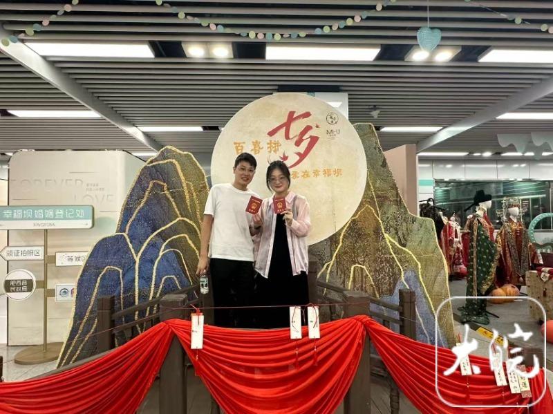 在宣誓台的合影区,刚拿到“红本本”的孙先生双手有些颤抖,“很开心、很激动。”他满眼爱意地望向妻子。记者注意到,孙先生还特意请了一位跟拍摄影师,“此前就了解到站内会布置一些打卡点,所以请了摄影师,把幸福的时刻定格下来。”