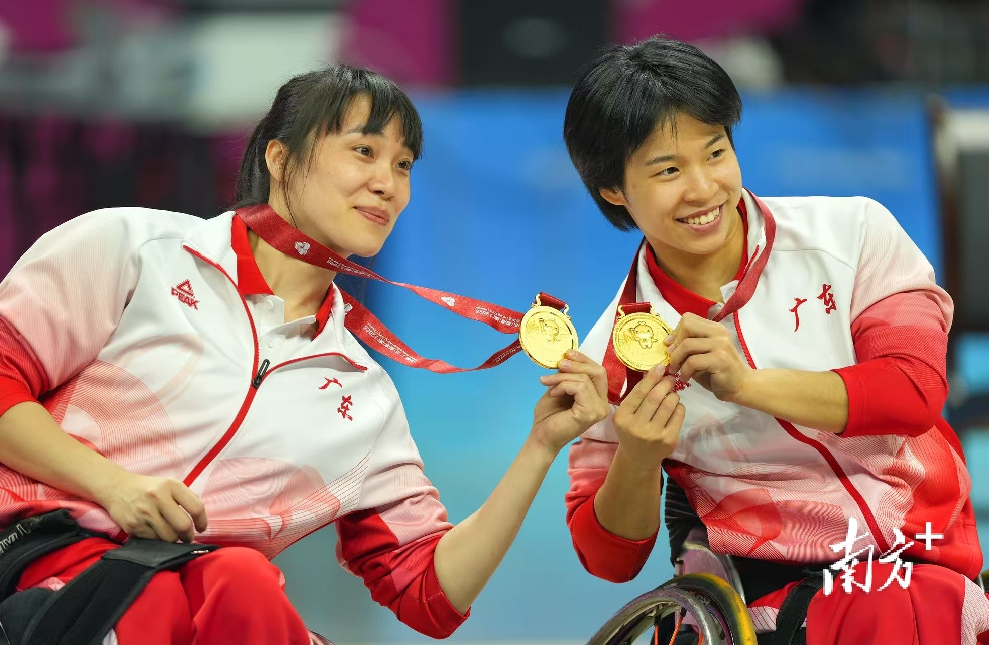 12月14日,残特奥会轮椅篮球五人制比赛女子组决赛完赛,广东队员展示金牌庆祝胜利。王俊涛 摄