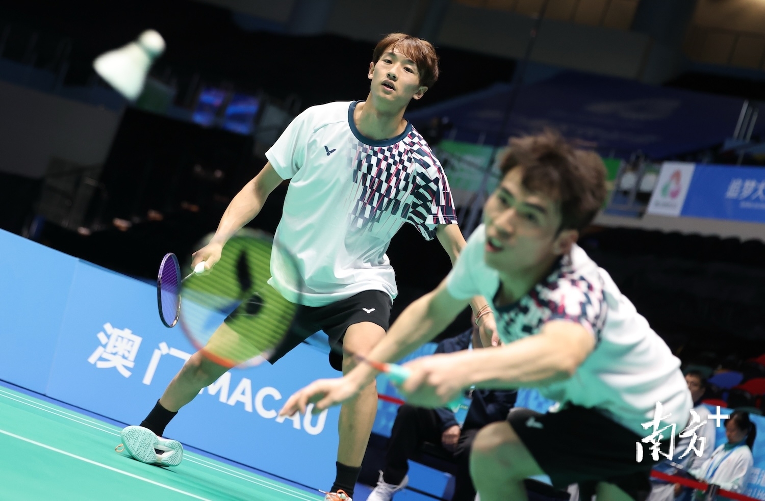 12月14日,残特奥会羽毛球项目在澳门最后一个比赛日。图为四川残疾人SL3-4(站姿下肢残疾分级)羽毛球运动员熊礼川(左)罗洋(右),在比赛中。许舒智 摄