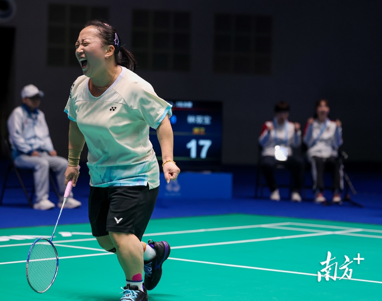 12月14日,残特奥会羽毛球项目,福建残疾人SH6(天生矮小身材残疾者)羽毛球运动员李凤梅,在赢得一分后为自己鼓气。许舒智 摄