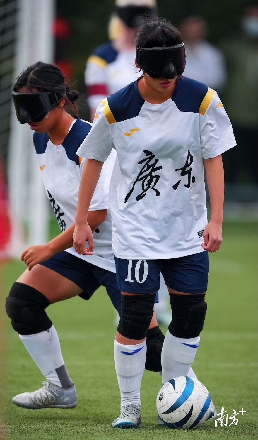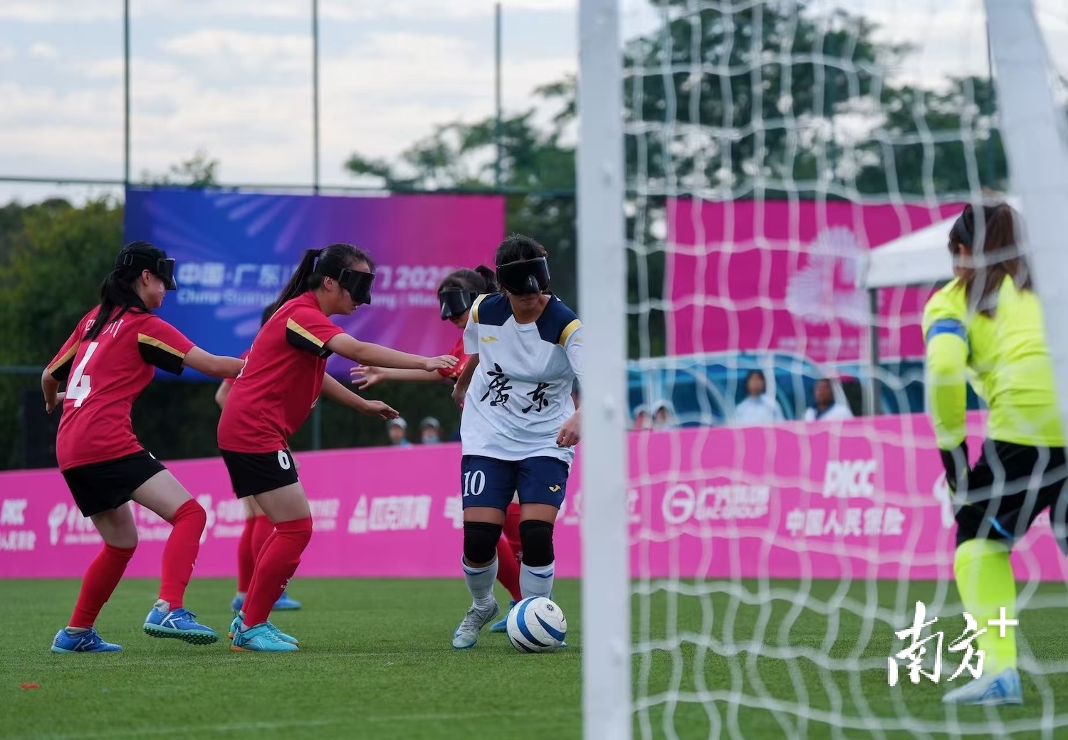 12月14日,残特奥会女子盲人足球项目比赛继续在广州大学城足球场进行。广东一团(白衣)完成赛程最后一场比赛,夺得银牌。王俊涛 摄