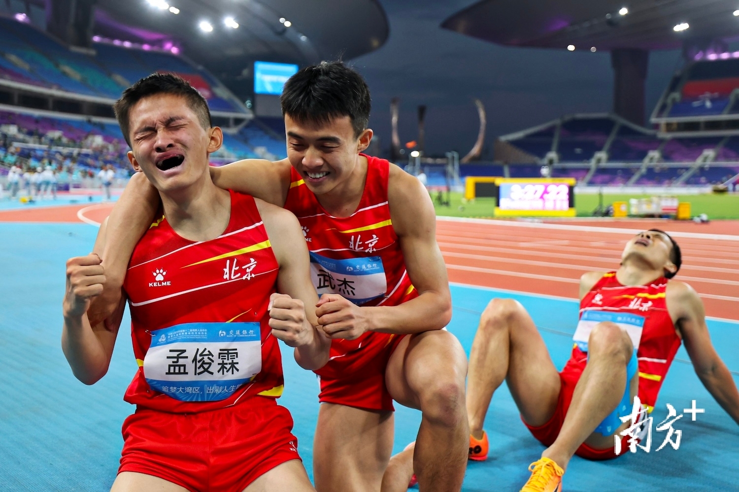 12月14日,残特奥会田径项目男子4×400米接力听障决赛,北京队获冠军后队员们激动落泪。郑新洽 摄