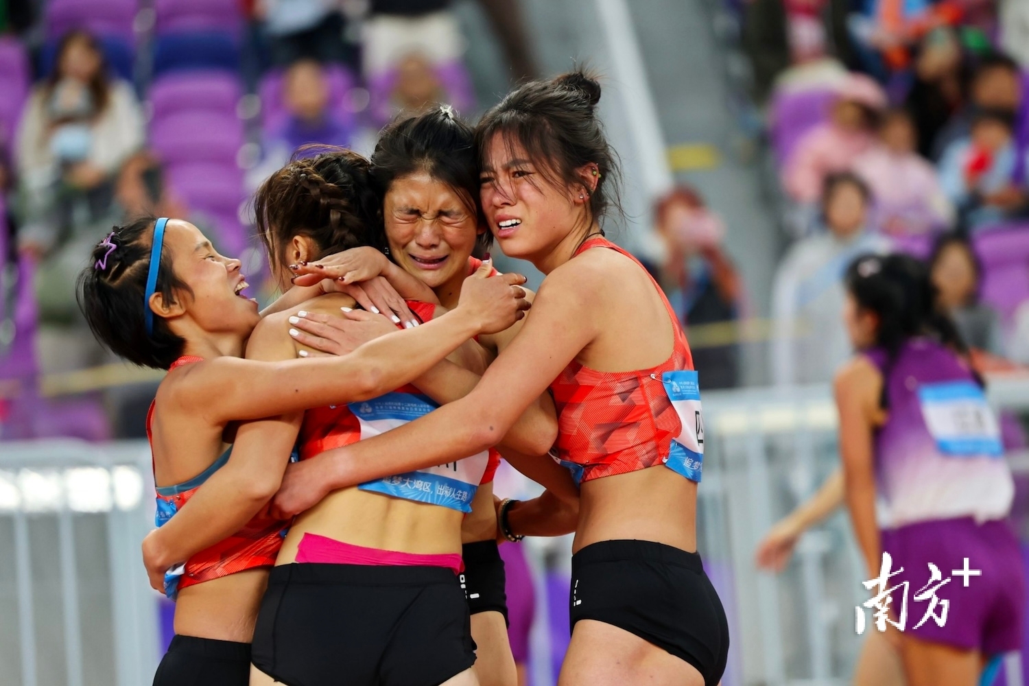 12月14日,残特奥会田径项目女子4×400米接力听障决赛,四川队在最后一刻实现反超获得银牌,队员们拥抱落泪。郑新洽 摄