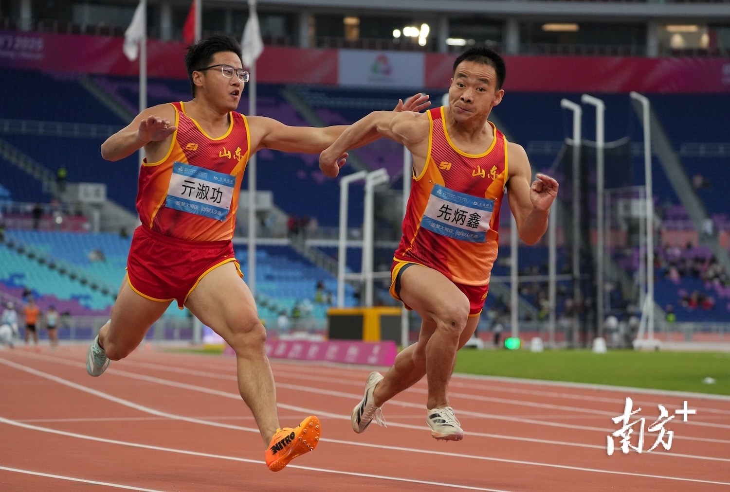 12月14日,残特奥会4×100米混合接力决赛,山东队亓淑功“拍了拍”接棒的运动员先炳鑫,完成交接棒。张迪 摄