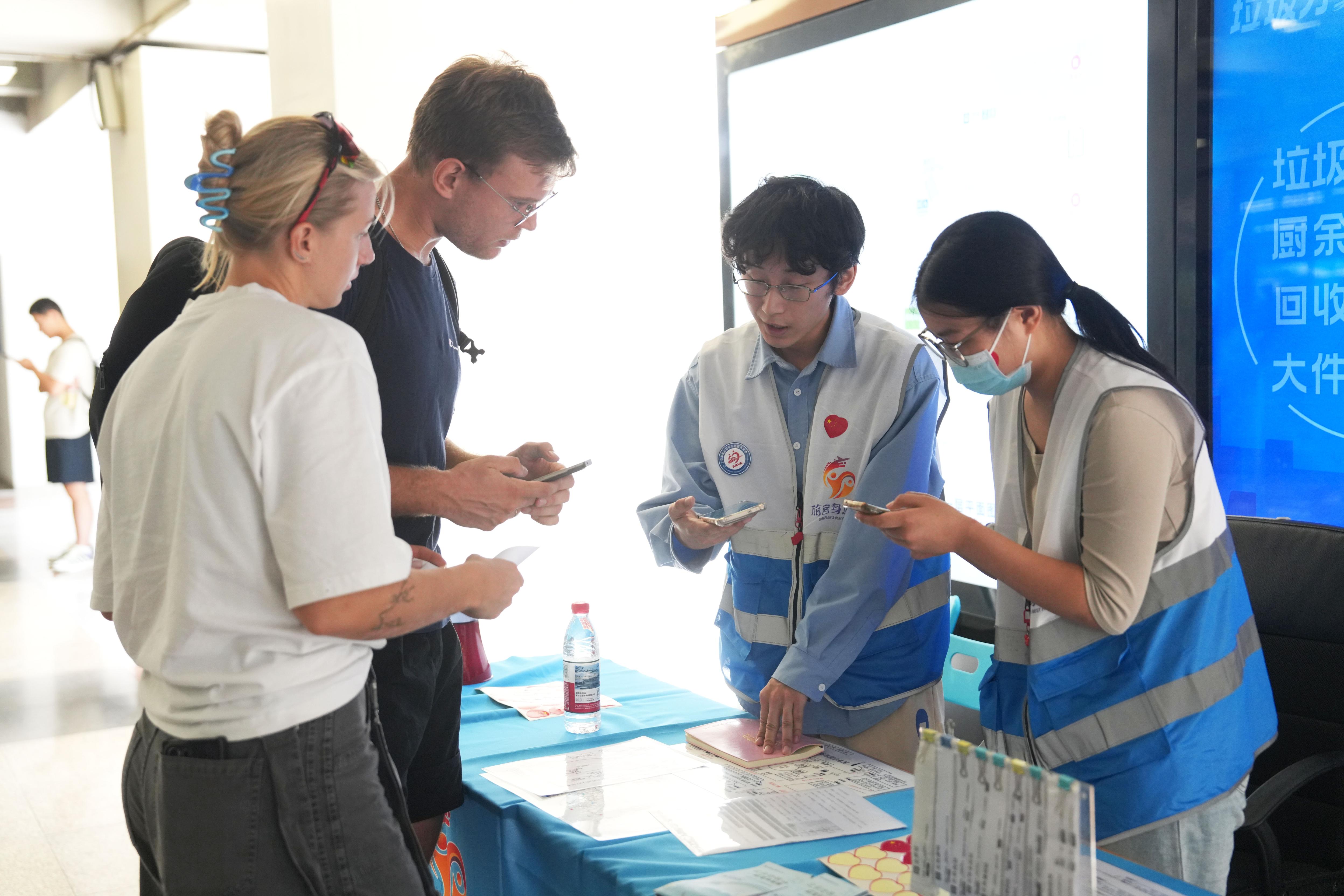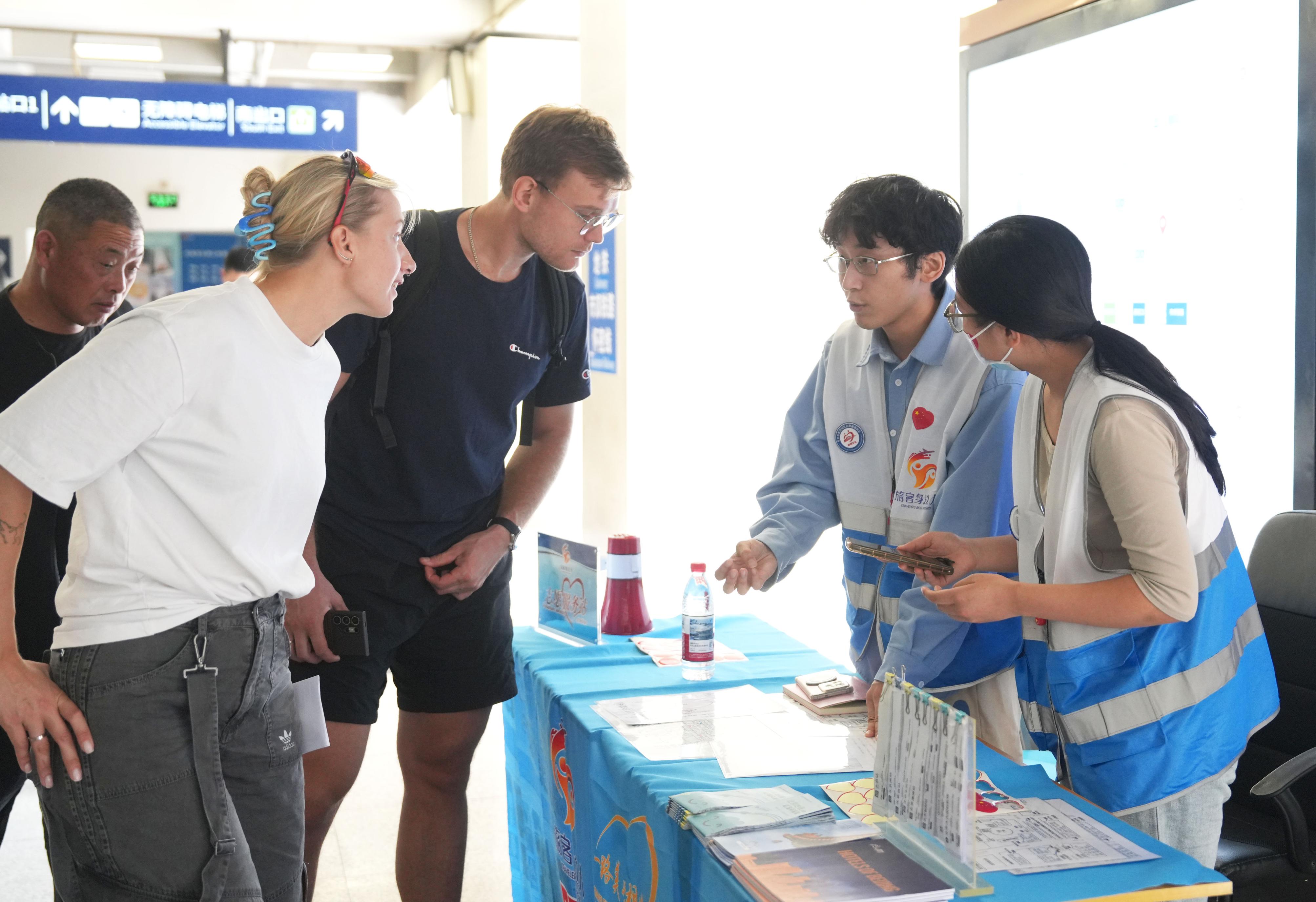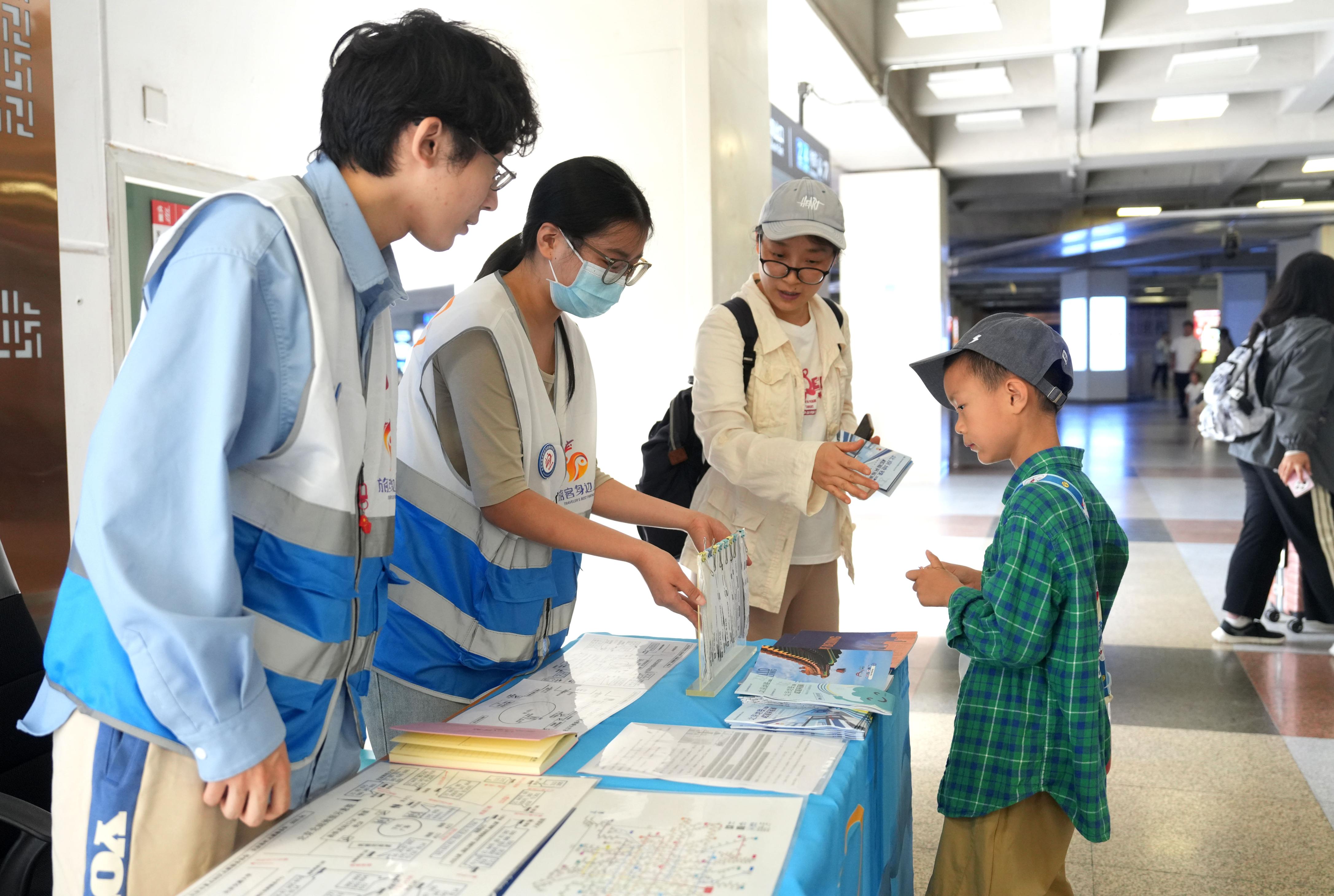 北京北站是前往八达岭长城的重要交通枢纽,客流量大。假期期间,北京市重点站区管委会在北京北站换乘大厅增设临时咨询台,招募来自北京交通大学的学生志愿者每日轮流值守。
